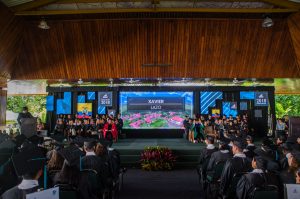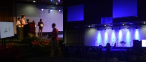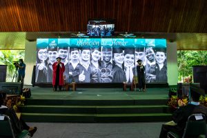 Escenario con un logo pequeño para las dimensiones del escenario y posiblemente esto sea necesario para no competir con tanto elemento, toda la facultad ubicada en el escenario, una pantalla que re-transmitía el circuito cerrado del evento, banderas y plantas. Tantos elementos restan protagonismo a los graduandos.